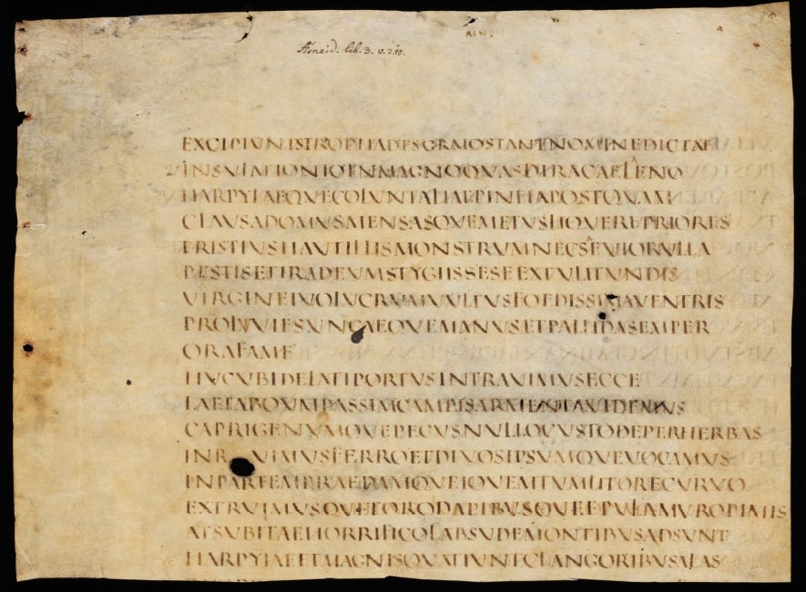 No doubt reading the text (Virgil's Aeneid book 3) in this 5th-century manuscript fragment was as difficult back then as it is now. With no separation between words (known as scriptio continua), reading was slow, focused and ruminative. At least the capital letters (Roman square capitals) improved visibility. St. Gallen, Stiftsbibliothek, Cod. Sang. 1394
