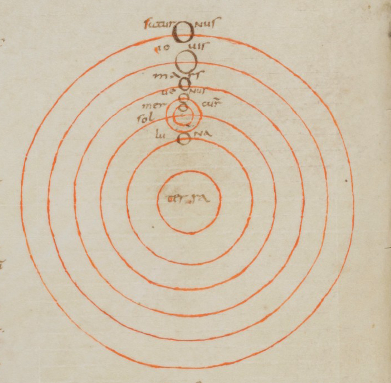 A 9th-century diagram of the Ptolemaic system with Earth at the centre, then the Moon (Luna), Sun (Sol), Mercury, Venus, Mars, Jupiter and Saturn, St. Gallen, Stiftsbibliothek, Cod. Sang. 248
