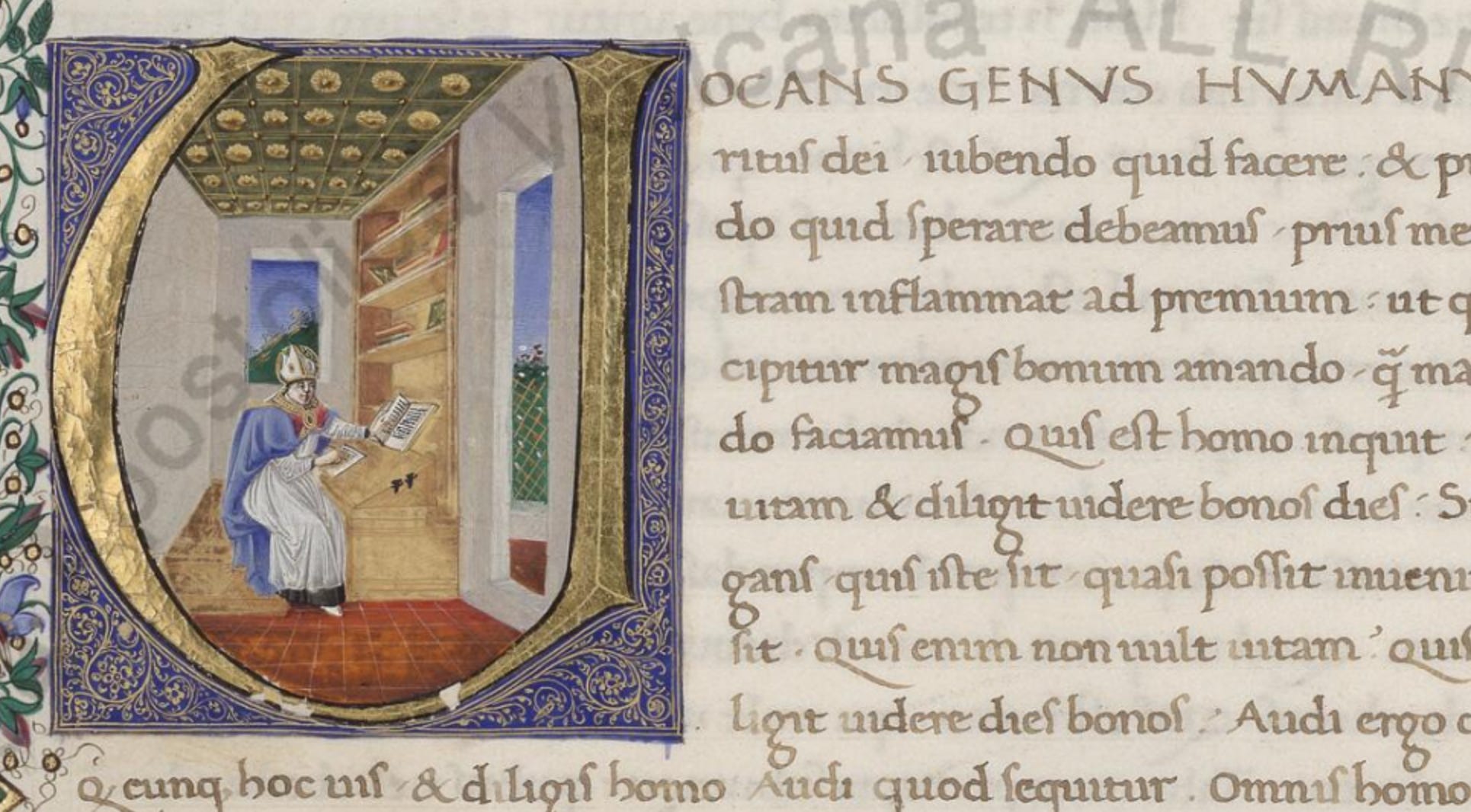 Augustine writing at his desk in a 15th century from Urbino, Vatican, BAV, Urb.lat.72