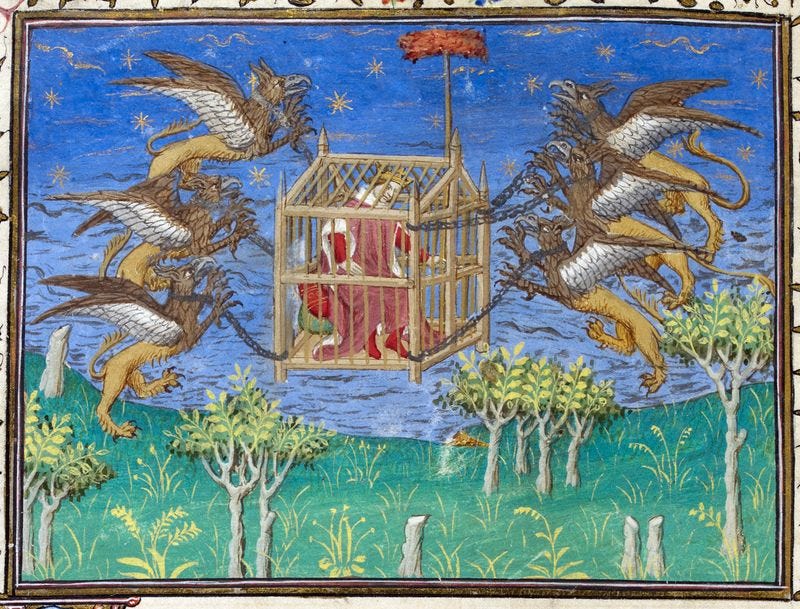 Myths know no boundaries, except the boundaries of myth. In a collection purporting to tell the 'vraye hystoire du bon roy Alixandre', Alex the Great figure of medieval myth is carried off by griffins in a cage (British Library, Royal 20 B XX)
