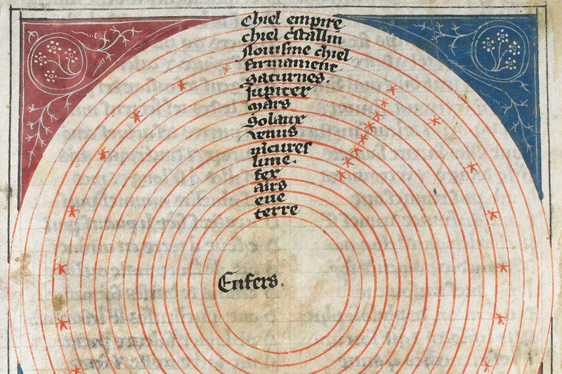 A variation of the Ptolemy-Aristotle model of the universe containing the elemental, planetary and metaphysical spheres from a 14th-century French manuscript (Chantilly, Musée Condé, 478)