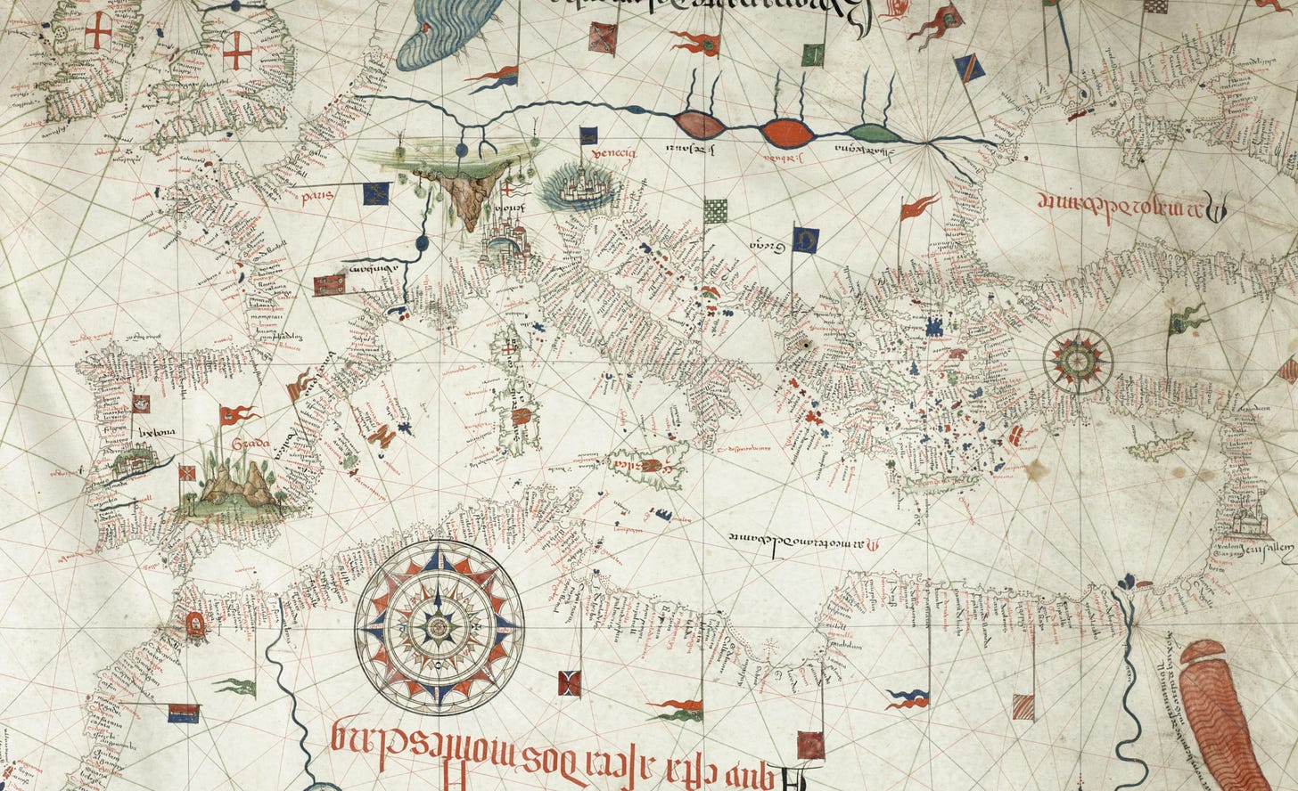 Portolan maps, like this one from 1492, are medieval nautical charts marked by accurate coastlines, rhumb lines radiating from wind roses, and a mile scale for measuring distances between ports. They focus solely on coastal features like ports and river mouths, aiding navigation through dead reckoning—a method of estimating position based on a previousl…