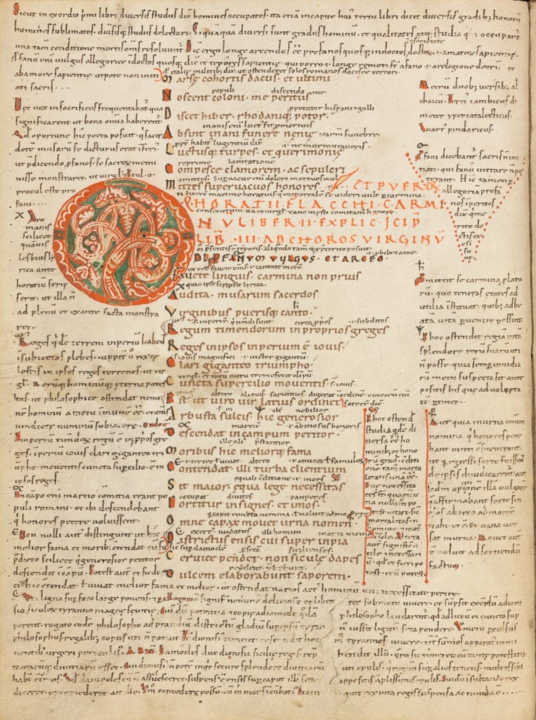 The web of texts in a 11th-century manuscript containing the poetic works of the Roman poet Horace (main, central text) surrounded by explanations, clarifications and comments, not without some decorative elements to guide the reading (Cologny, Fondation Martin Bodmer, Cod. Bodmer 88)